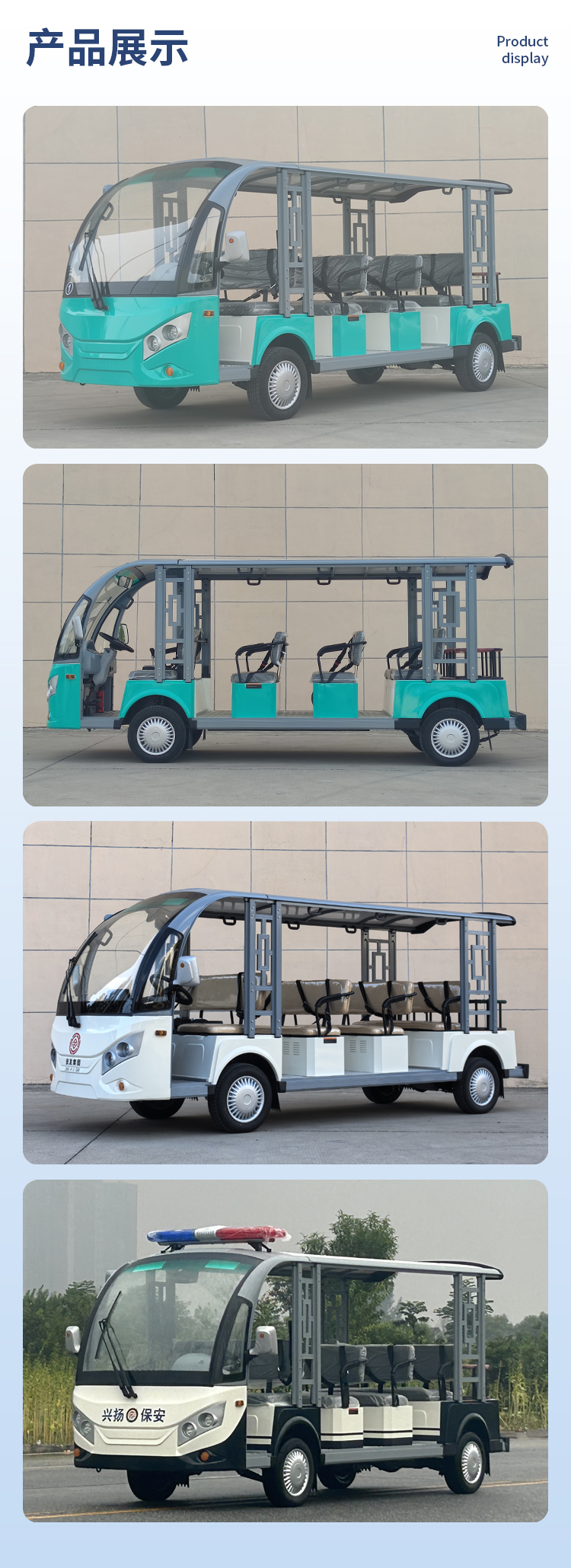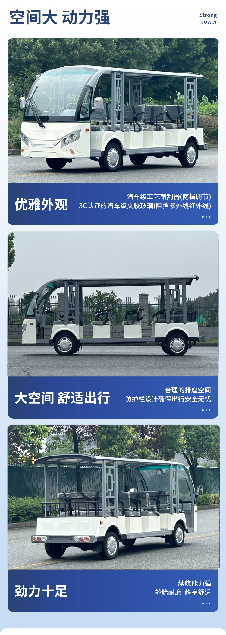 JLGD型系列電動觀光車不僅有簡潔、大方、飽滿、美觀的外形設(shè)計,還搭配人體學(xué)設(shè)計的豪華PU面料座椅,防滑鋁花紋地板,鈑金、GFRP玻璃纖維及鋁型材輕量化設(shè)計的車身,美觀耐用,使得該車成為景區(qū)的亮點和宣傳名片。