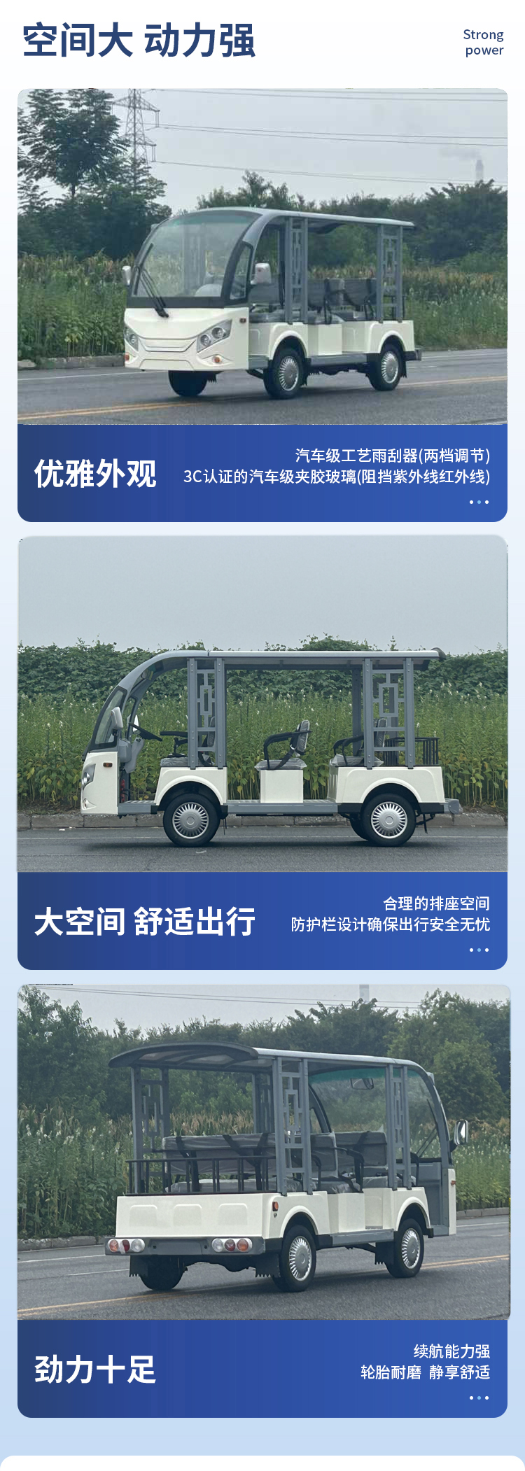 JLGD系列電動(dòng)觀光車不僅有簡(jiǎn)潔、大方、飽滿、美觀的外形設(shè)計(jì),還搭配米黃色的內(nèi)飾布置,外加皮革座椅及扶手,使得該車成為景區(qū)的亮點(diǎn)和宣傳名片。